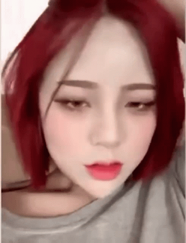 Leya Cheng with vibrant red hair and striking red lips in a captivating close-up.