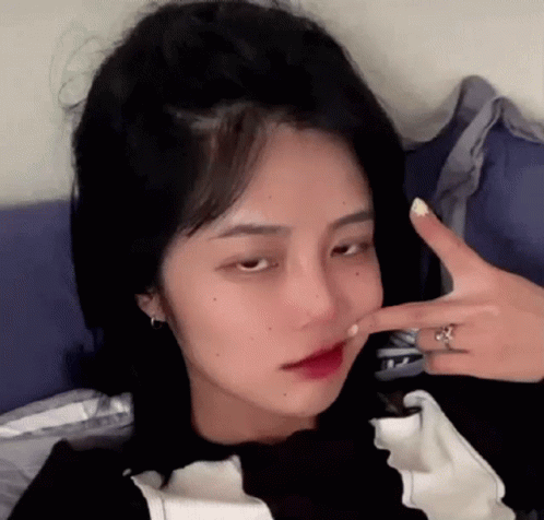 Leya Cheng makes a funny face with her finger in her mouth while lying down, wearing a black and white top.