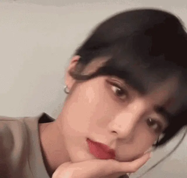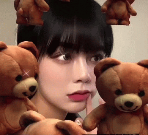 Leya Leya Cheng poses with a cute teddy bear filter, touching her lips playfully.