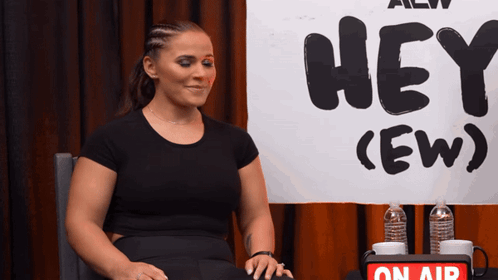 Leyla Hirsch smiles and laughs while sitting in front of an 'AEW Hey (EW)' sign, appearing on a show.