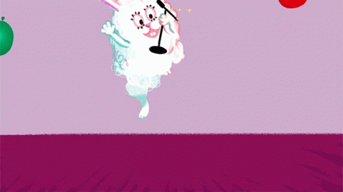 A fluffy white cartoon rabbit sings 'Happy Birthday' into a microphone, surrounded by colorful balloons and sparkling confetti.