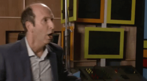 Xander Jeanneret, Bonnie Gordon, and Jeff Lewis from Library Bards react with surprise on set.