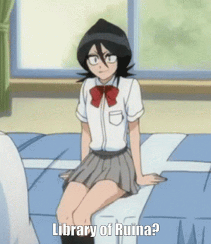 Anime girl looks confused, asking 'Library of Ruina?' in a meme format.