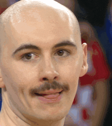 A bald man with a mustache playfully sticks out his tongue, looking directly at the camera.