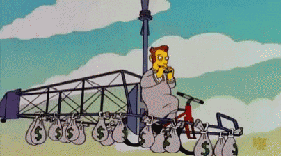 Lider Simpsons (Mr. Burns) vuela en un helicóptero casero, tocando la armónica y llevando bolsas de dinero.