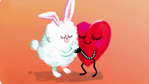 A fluffy white rabbit and a red heart with arms and legs share a warm embrace, radiating love and happiness.