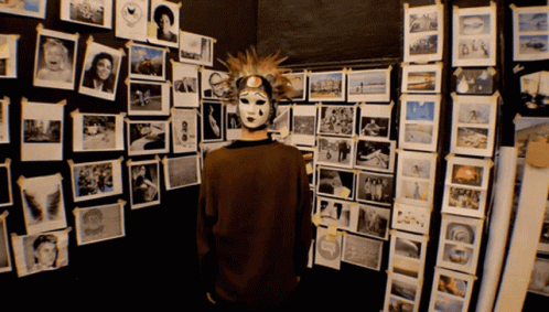 Käptn Peng greets viewers with 'Hallo Freunde!' in a photo-covered room, after removing a mask.