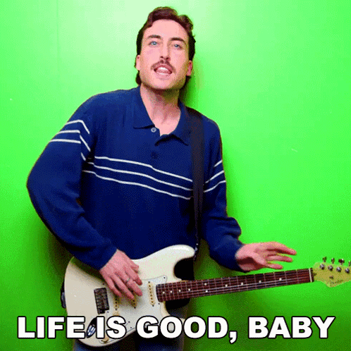 Ryan Culligan plays guitar and shares his 'Life Is Good, Baby' vibe in a blue sweater.