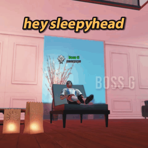 Boss G from Lifeafter relaxing on a lounge chair with 'hey sleepyhead' and 'GOOD MORNING' messages.