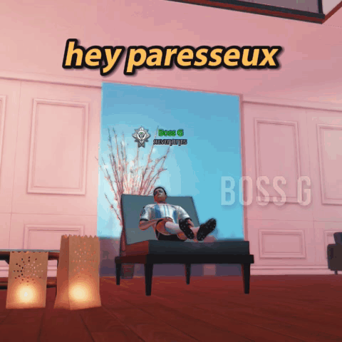 A character named Boss G from the game Lifeafter is shown relaxing in a chair, with French text "hey lazy" and "hello".