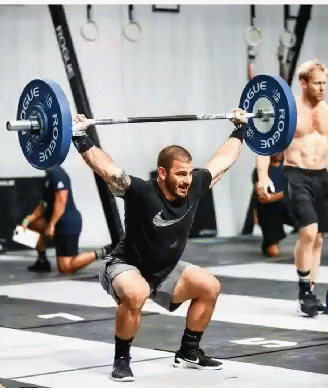 Man performing an overhead squat with a barbell in a gym setting, demonstrating strength and technique.