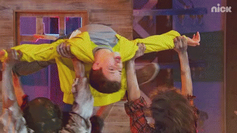 A boy in a yellow jacket performs an impressive dance lift, held aloft by others on Lip Sync Battle Shorties.