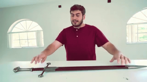 Man in a red shirt lifts a large sword with a dark scabbard from a white table, showcasing the weapon.