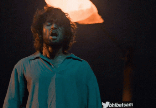 Vijay Devarakonda in an intense scene from Liger, screaming with raw emotion under a fiery light.