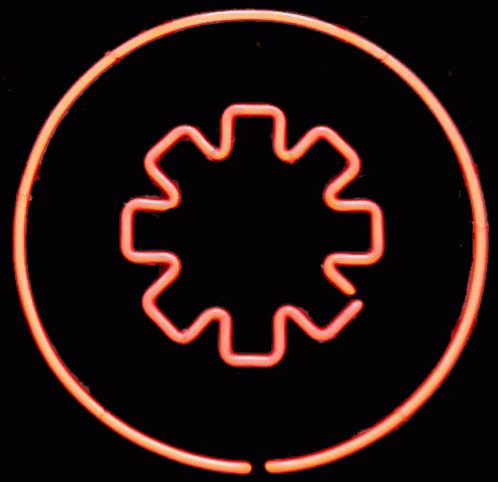 A vibrant Red Hot Chili Peppers neon sign, featuring their iconic asterisk logo, flashes with red and white lights.