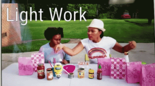 Eva Del Aire and another woman participate in a 'Light Work' challenge, featuring various food items.