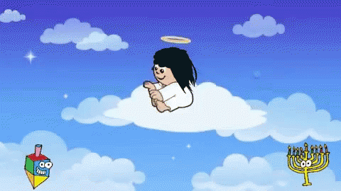 Lika the angel peacefully sleeps on a soft cloud in the sky, accompanied by whimsical cartoon elements.