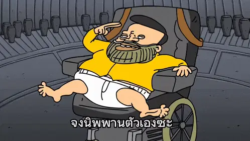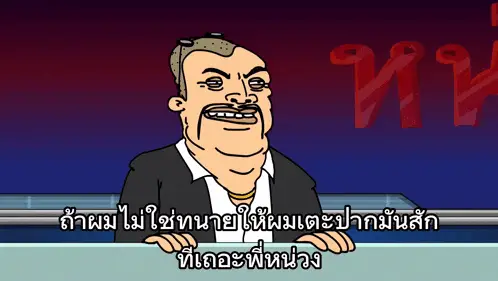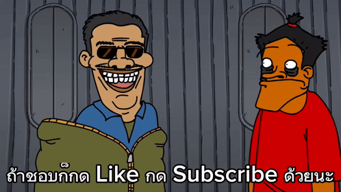 Cartoon character เอ็มสายเต๊าะ asks viewers to Like and Subscribe to the channel.