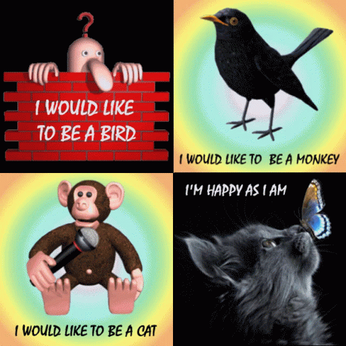 A humorous collage of animals and a character expressing wishes to be other creatures, with a cat content as it is.