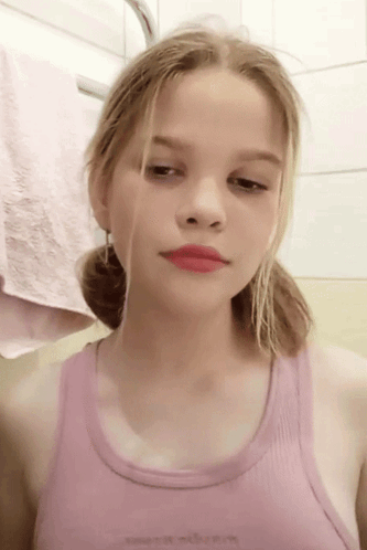 Peri from Likee, wearing a pink tank top and red lipstick, looks directly at the camera.