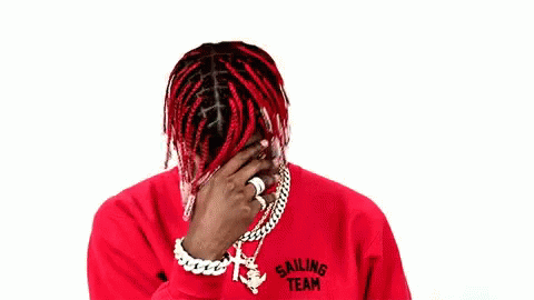 Lil Yachty, with his signature red dreadlocks, covers his face while shaking his head in a red sweatshirt.