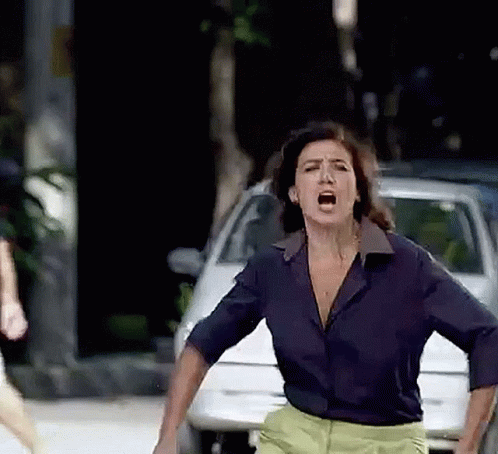 Lilia Cabral as Griselda, holding a wrench and yelling passionately in a street scene.