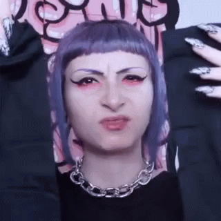 Lilly Meraviglia makes a confused and funny face, wearing purple hair and a chain necklace.