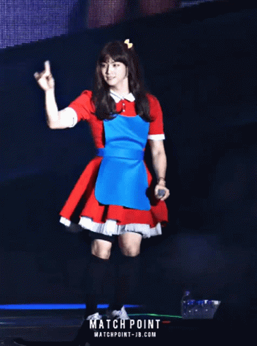 GOT7's Lim Jaebum (JB) performs in a red dress and blue apron on stage.