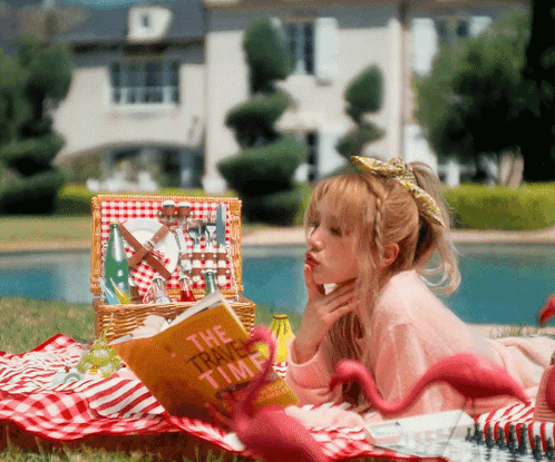 Yuqi from (G)I-DLE relaxing by the pool, reading 'The Travel Time' book during a picnic.