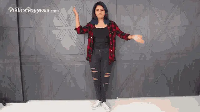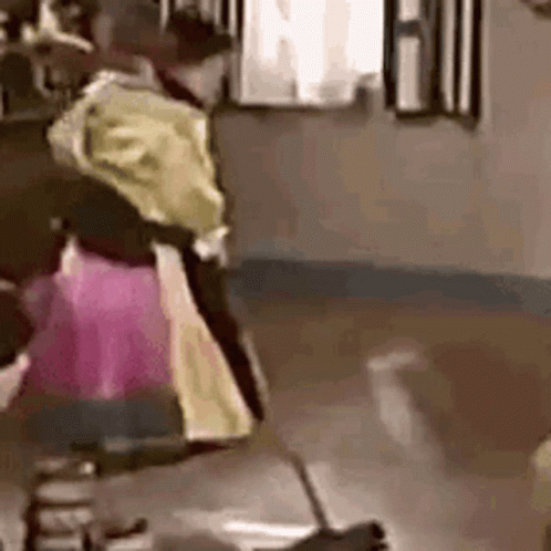 India Maria cleaning and dancing in traditional attire, moving rhythmically while sweeping the floor.