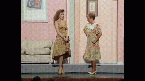 Lina Morgan performs a comedic sketch on stage with another actress, making a funny face.