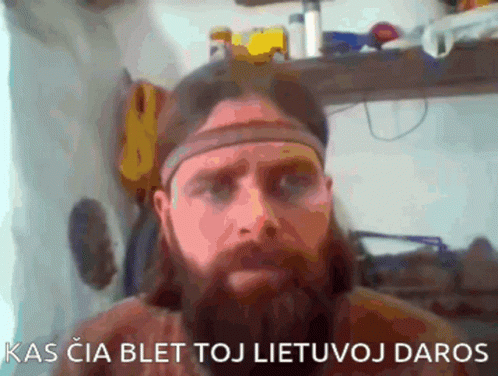 Linas Hermanas, a man with a beard and headband, expresses frustration, asking 'What the f*** is happening in Lithuania?'