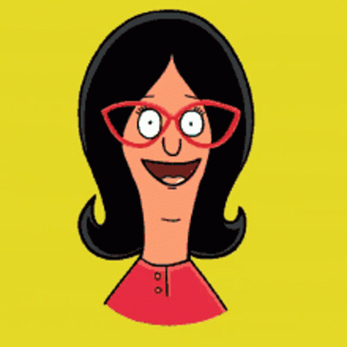 Linda Belcher from Bob's Burgers smiles brightly, wearing her signature red glasses and shirt.