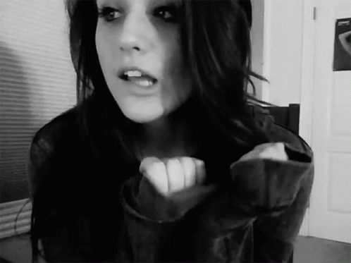 A black and white close-up of a young woman with dark hair, looking to the side.