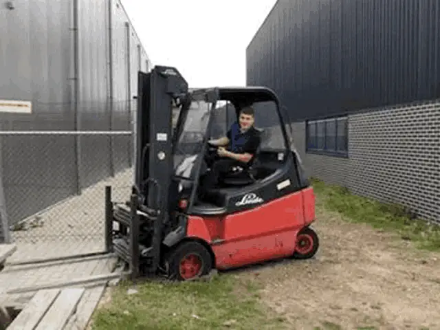 Animated cartoon of a Linde Lindemh forklift carrying packages.