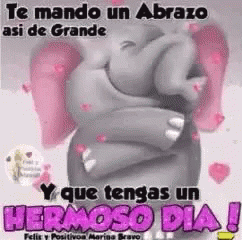 An animated elephant gives a big hug with the Spanish message: 'Te mando un Abrazo asi de Grande Y que tengas un Hermoso Dia!'