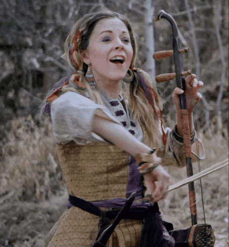 Lindsey Stirling plays the violin with a joyful expression, possibly blowing a kiss, in a vibrant costume.