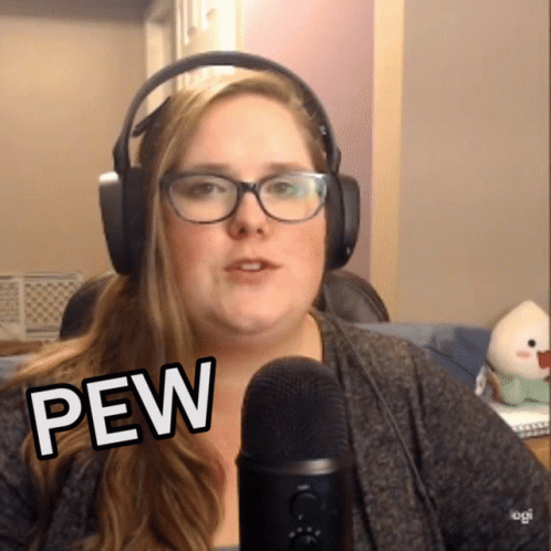 Linii, wearing headphones and glasses, makes finger gun gestures with 'PEW' and 'FINGER GUNS' captions.