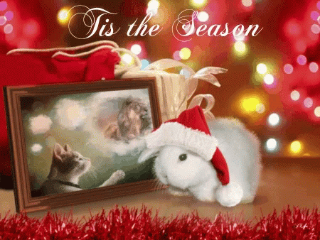 A festive white rabbit in a Santa hat sits beside a framed picture of a cat gazing at a lion, with 'Tis the Season' text.