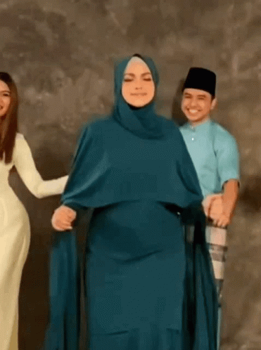 Siti Nurhaliza in a green hijab, celebrating Lip Lap Raya with others, smiling and posing.