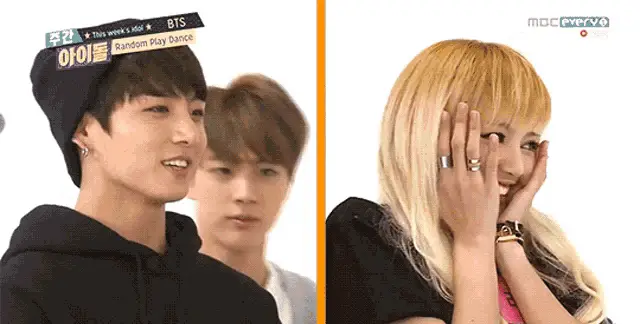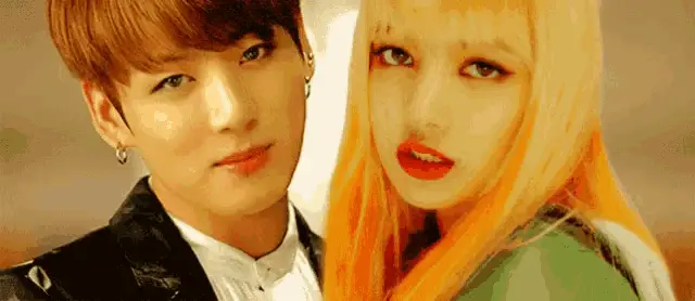 Jungkook from BTS and Lisa from Blackpink are seen standing together, looking towards the camera.