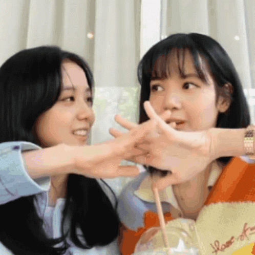 Lisoo Seulisasoo playfully make a heart shape with their hands, smiling brightly at the camera.