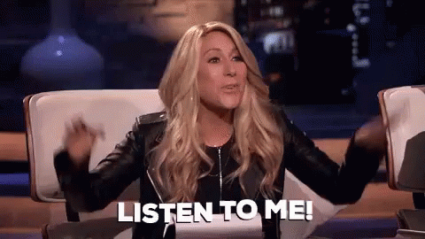 A woman from Shark Tank emphatically gestures with "LISTEN TO ME!" on screen, demanding attention.