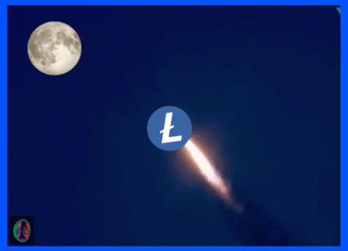 Litecoin symbol launching like a rocket towards the moon, representing crypto growth and "to the moon" aspirations.