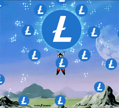 Goku gathers energy for a Litecoin Spirit Bomb, surrounded by LTC symbols in a crypto-themed animation.