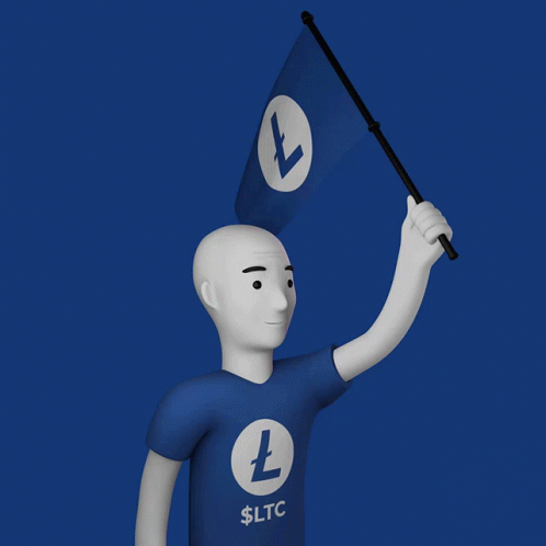 Animated Wojak character proudly waving a Litecoin LTC flag, wearing a matching shirt with the crypto logo.