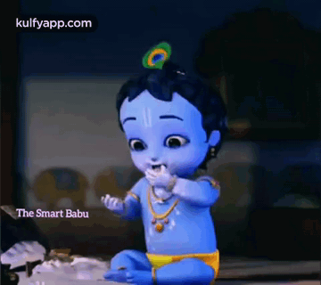 Adorable animated Little Krishna making cute and playful gestures, wearing traditional attire and a peacock feather.