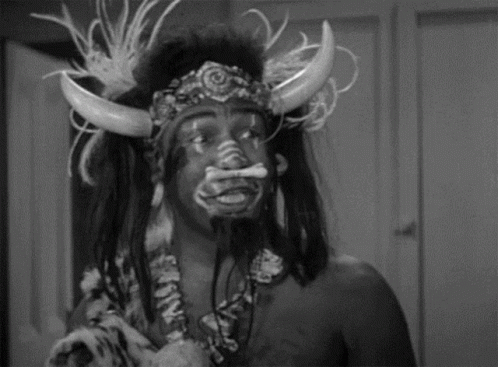 A man from Little Rascals is depicted in a black and white still, wearing an elaborate tribal-like costume.