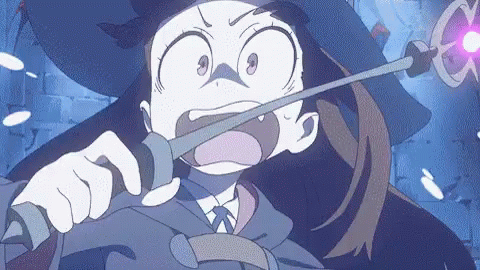 Akko Kagari from Little Witch Academia intensely casts a powerful magic spell with glowing pink energy.