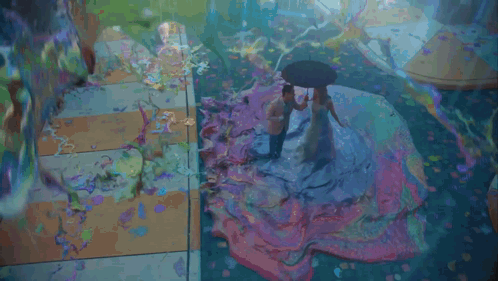 Taylor Swift and Brendon Urie are seen in a vibrant, colorful rain scene, under an umbrella and on a liquid surface.